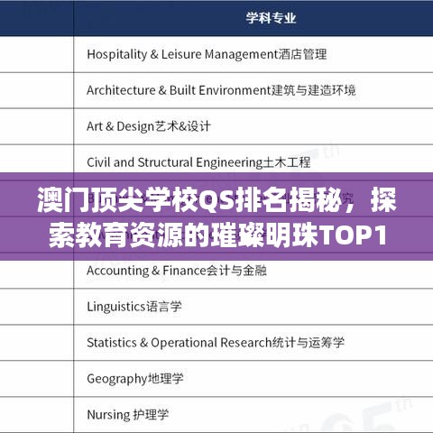 随着全球教育的不断发展,澳门地区的学校也在国际舞台上展现出越来越强的竞争力,本文将为您详细介绍澳门学校QS排名前十名,带您领略顶尖教育资源的璀璨明珠。